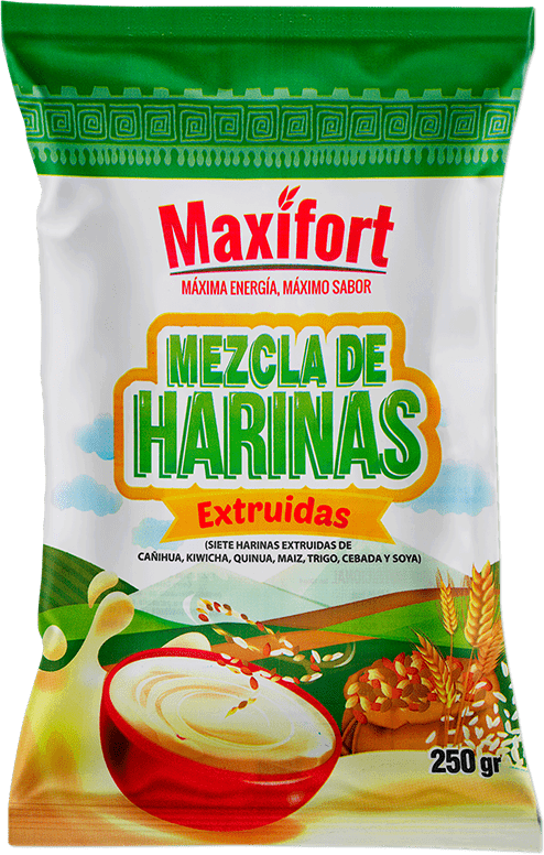 Es un alimento elaborado a base de granos andinos, pre-cocidos y molidos ricos en carbohidratos, proteínas y minerales. 7 Harinas Maxifort es un producto muy nutritivo, contiene: quinua, soya, avena, trigo, cebada, kiwicha y arroz además de ser enriquecida con vitaminas y minerales.